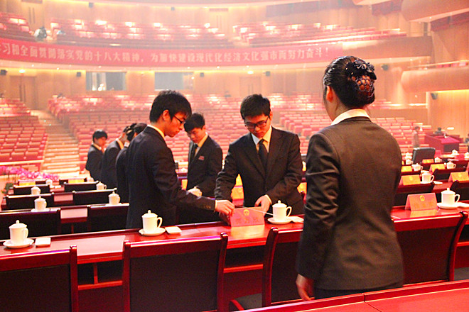 由于本次會議市政府要求不安排專業禮儀公司承接,這樣會務的服務接待任務也全部落在了公管公司。為做好會議接待服務工作,從2012年12月中旬開始,公管公司挑選了35名人員并聘請專業講師進行培訓。除此之外,公管公司執行董事李坤明親率公管公司領導班子成員和員工全面投入會務保障工作。會務期間,投入保潔75人,保安42人,接待35人,消防18人,電力保證12人,物資保障20人,制作安裝宣傳標語和引導牌200多塊,擺放花卉200多盆,鋪設地毯3341 平方米,調用桌子180張,椅子250把,沙發15套,各類會議用品30多個品種。全面、高效、順利完成了對本次會議的保障工作。