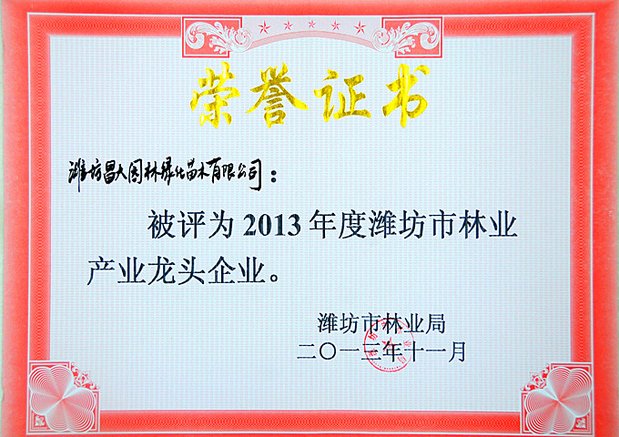 2013年11月15日,濰坊市林業產業工作會議在臨朐縣召開,在這次會議上,集團園林綠化苗木有限公司被評為“2013年度濰坊市林業產業龍頭企業”。根據有關規定,濰坊市級林業龍頭企業將在同等條件下優先享受各級財政造林補貼、撫育補貼、貼息、稅費減免等政策優惠。 集團園林綠化苗木有限公司自成立以來,依托集團的平臺優勢,深入實施林業產業化導向,積極調整、合理布局苗木結構,按照品牌化運營,差異化競爭的思路,推行精細化管理,做到了“人無我有,人有我優,人優我奇”,培養了一大批精品苗木,為濰坊林業產業發展、農民增收、農業增效起到了良好的示范和推動作用。