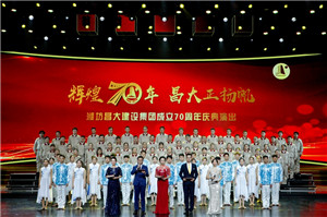 櫛風沐雨砥礪行,春華秋實滿庭芳。2019年10月16日晚,慶祝集團70華誕文藝晚會在濰坊文化藝術中心大劇院隆重上演。 集團高管層領導徐鵬強、朱九洲、穆乃杰、姜建魯、閆鵬、房海、劉雁冰、張學智、吳杰出席。黨委書記、董事長徐鵬強代表領導班子致辭,表達了對黨的感恩之情。感謝各級政府和社會各界的大力支持,感謝一代一代昌大人的砥礪前行和奮斗,感謝昌大員工家屬的無私奉獻。集團技術負責人、商務經(jīng)理及以上骨干人員現(xiàn)場觀看演出。 集團特別感謝濰坊市歷屆黨委和政府一直以來對昌大的關愛和支持,特邀幫助昌大走出困境實現(xiàn)良性發(fā)展的黃濰連、劉偉、潘強等市里的老領導代表,特邀集團合資、合作等有關方面的代表,特邀集團改制前擔任過集團正職的部分老領導以及改制后擔任過集團領導后來退下來的老領導,特邀企業(yè)發(fā)展之初老領導的家屬代表,特邀集團榮獲省和全國勞動模范代表,特邀集團基層單位經(jīng)理助理、集團總部全體、集團中層以上人員的家屬代表出席觀看文藝演出。 主題為“輝煌七十年?昌大正揚帆”的慶典晚會,在一曲《在燦爛的陽光下》歌舞中拉開帷幕。晚會總體分為“致敬昨天?致敬今天?致敬未來”三個篇章,共十七個節(jié)目。無論是歌頌昌大人的歌曲《堅守》,還是謳歌關心昌大各界的相聲《非常嘉賓》,無論是《流光溢彩》的城市脈動,還是訴說過去的《往事只能回味》,無論是描寫建筑人的《我們和城市在一起》,還是表現(xiàn)昌大建設鐵軍精神的《城市筋骨》,無論是音詩畫般的《昌大一家人》,還是表現(xiàn)昌大員工情懷的《多想在平庸的生活擁抱你》,昌大人都在《致敬昨天》、《致敬今天》、《致敬未來》朗讀聲中盡情釋懷。昌大七十年,我們在《萬紫千紅分外嬌》的環(huán)境中奮發(fā),我們在《我和我的祖國》歌聲中與共和國一起成長。70年的奮斗,我們凝聚了《善建者的力量》。 昌大輝煌七十年,我們用頒發(fā)《昌大建設七十年》一書的隆重禮儀,揭開昌大歷史那頁頁篇章、續(xù)寫未來的美好與輝煌。 我們禮贊新中國七十年壯麗篇章;我們禮贊昌大七十年的美麗詩篇。七十年,我們感恩黨的陽光沐浴;我們感謝社會各界支持;我們感激昌大歷代員工;我們感慨昌大歷久彌新。 晚會讓昌大更加凝聚起了邁向新時代的力量,吹響了百年昌大的號角,讓我們“團結奮斗,做新時代的建設者”! 晚會由濰坊電視臺內(nèi)專業(yè)人士執(zhí)導。濰坊電視臺、濰坊人民廣播電臺的嘉賓參與晚會主持和有關節(jié)目演出。 晚會現(xiàn)場,濰坊新聞網(wǎng)進行了現(xiàn)場直播,半島網(wǎng)、今日頭條、騰訊視頻、優(yōu)酷、搜狐、愛奇藝、第一視頻、天天快報等進行了視頻轉播和錄播;大眾網(wǎng)濰坊、半島網(wǎng)、今日頭條、天天快報、光新聞、濰坊早讀、濰坊日報、濰坊晚報等持續(xù)進行文字播報和轉發(fā)。 慶祝集團七十華誕的大型活動,集團高管層領導正確決策和運籌,各活動團隊圍繞目標和中心任務全力推進、團結協(xié)作,順利完成各項活動,達到了通過活動凝聚企業(yè)內(nèi)生動力、提升昌大品牌社會影響力、激勵廣大青年員工為未來而奮發(fā)的目的。在此,集團向所有參與活動的單位和個人表示感謝!