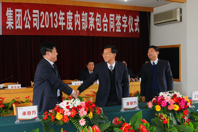2013年4月20日下午,集團公司2013年度內部經營承包合同簽字儀式在集團總部第一會議室舉行。集團公司高管層領導徐鵬強、朱九洲、滕忠斌、李坤明、姜建魯、穆乃杰、張連悅、張學智、閆鵬、劉雁冰,17個簽約單位領導班子成員、總部部室負責人共80人參加了承包合同簽字儀式。