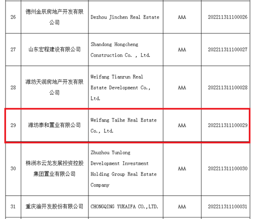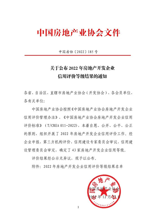 2022年12月27日,中國房地產業協會公布了2022年全國房地產開發企業信用評價等級結果,全國43家房地產開發企業經嚴格、公正評審后獲評信用等級。集團泰和置業榮獲此次信用評價的最高等級——AAA級,這也是泰和置業繼2016年、2019年獲評AAA級后,再次獲得國家權威機構的肯定。