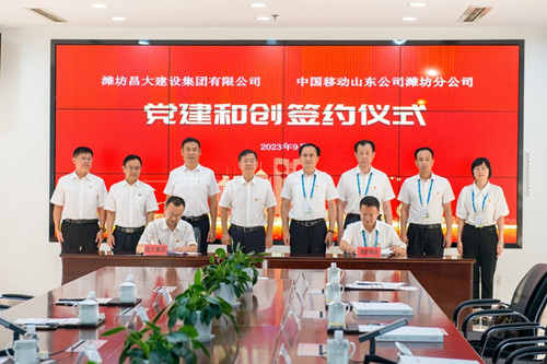 2023年9月13日下午,濰坊昌大建設集團與中國移動山東公司濰坊分公司“黨建和創(chuàng)”戰(zhàn)略合作協(xié)議簽約儀式在濰坊移動總部辦公樓舉行。集團公司黨委書記、董事長徐鵬強,濰坊移動黨委書記、總經(jīng)理李亞平出席簽約儀式。集團公司紀委書記穆乃杰與濰坊移動黨委委員、工會主席、副總經(jīng)理李廣代表雙方在協(xié)議書上簽字。