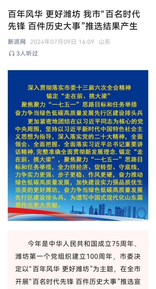“百名時代先鋒、百件歷史大事”將進一步推動全市各級深入學(xué)習(xí)貫徹習(xí)近平總書記視察山東重要講話精神,按照市委十三屆六次全會的部署要求,錨定“走在前、挑大梁”,自信自強、開拓創(chuàng)新、敢為爭先、勇毅前行,在新征程新起點上全面提升各項工作檔次水平,奮力推動綠色低碳高質(zhì)量發(fā)展,加快建設(shè)實力強品質(zhì)優(yōu)生活美的更好濰坊,為譜寫中國式現(xiàn)代化山東篇章作出更大貢獻。