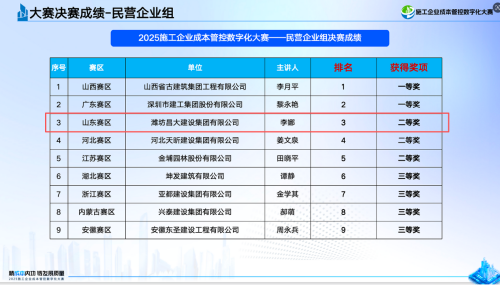 近日,備受建筑行業關注的“2025施工企業成本管控數字化大賽總決賽暨頒獎典禮”在北京圓滿落幕。集團公司憑借扎實的成本數字化實踐成果,從全國近三千家參賽企業中脫穎而出,最終斬獲民營企業整體排名第三、民營企業組二等獎的優異成績。
